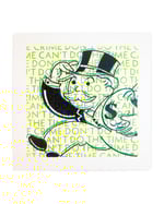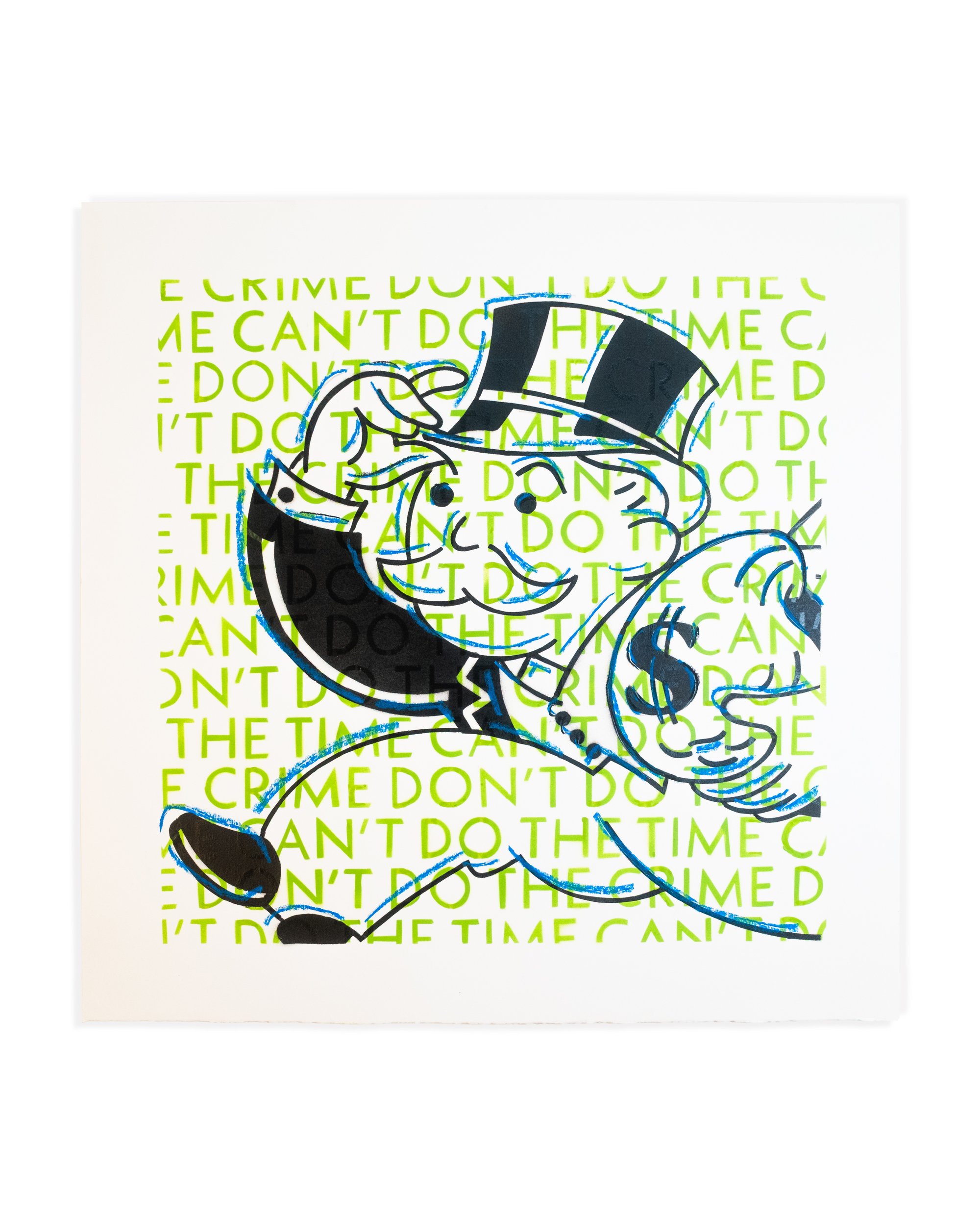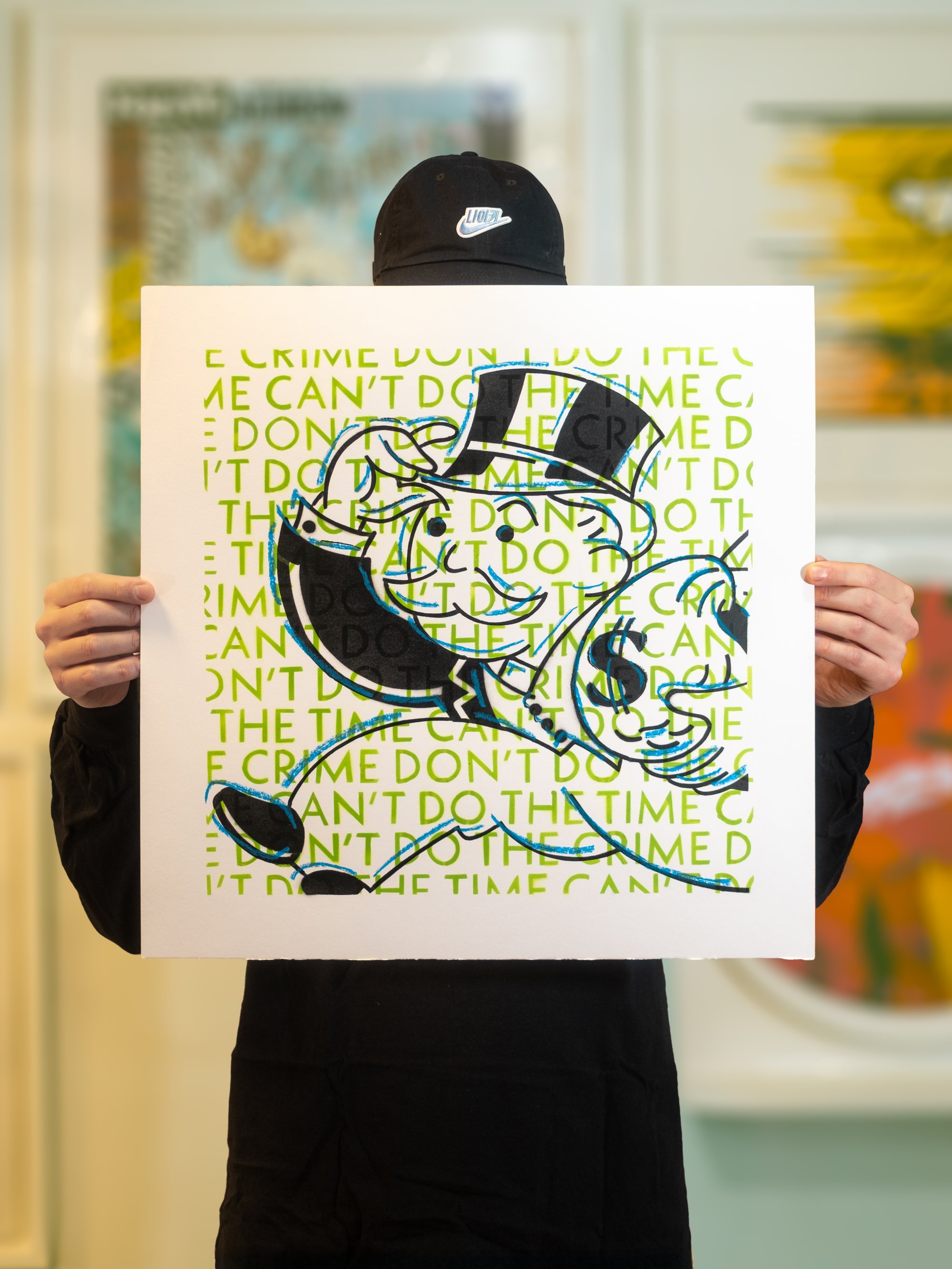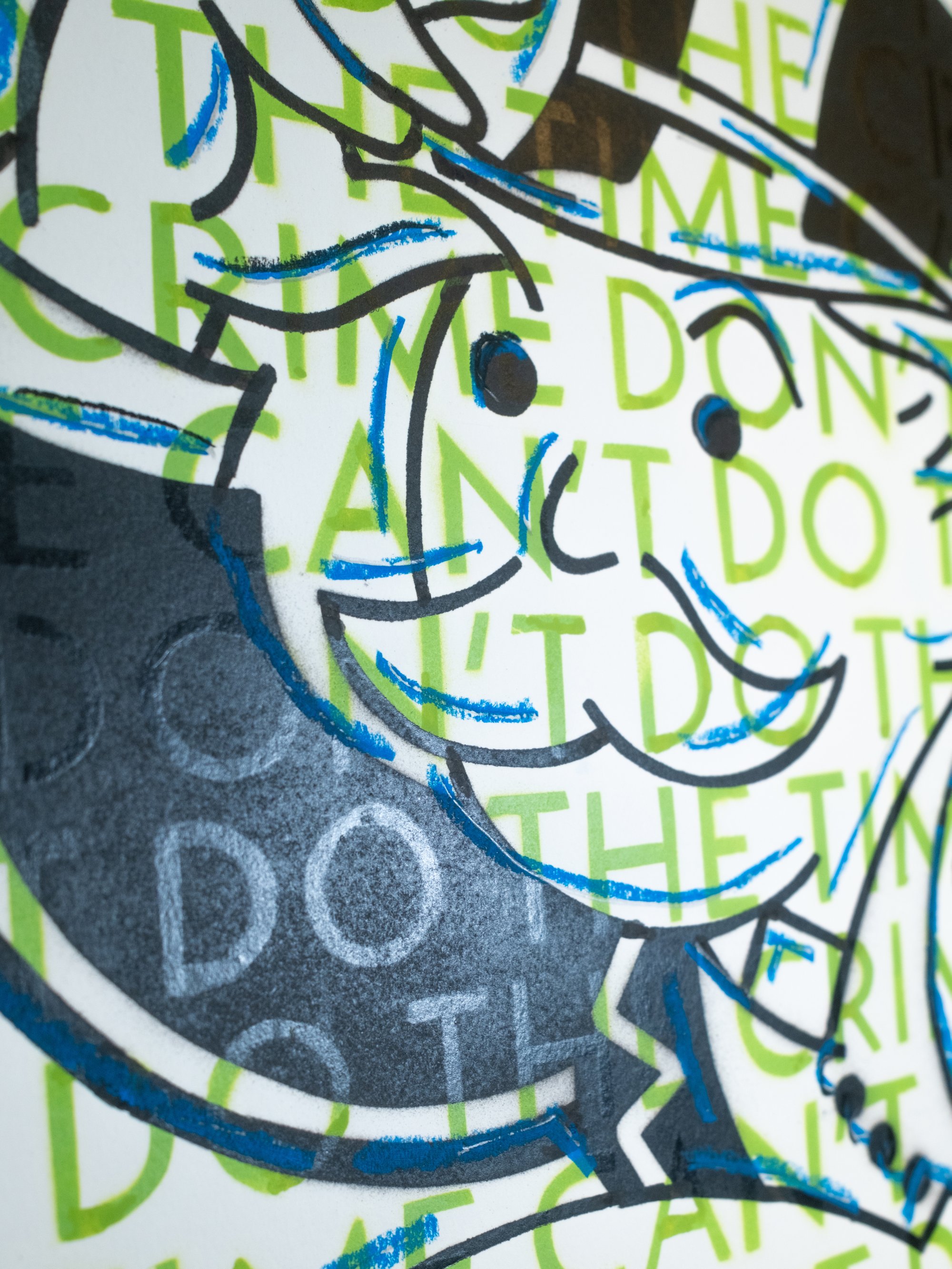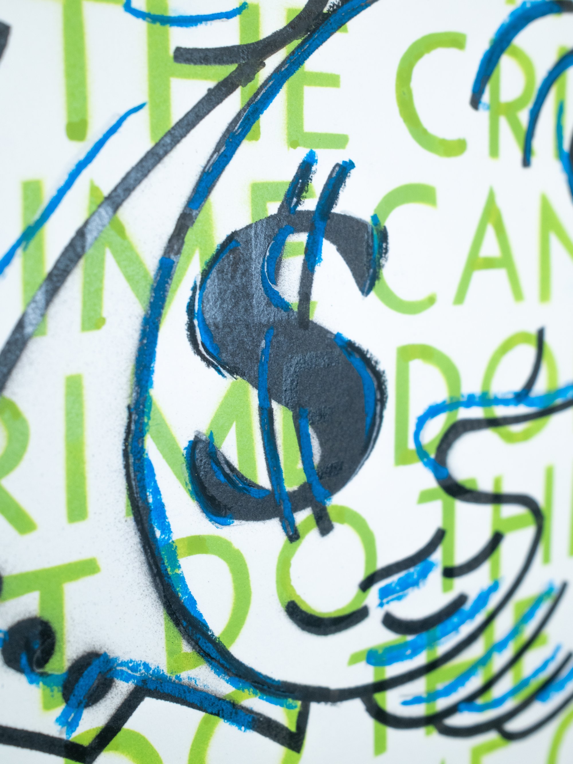 The piece is made the slow way. Hand cut stencils, spray paint, ink, then a slightly wonky pastel finish.